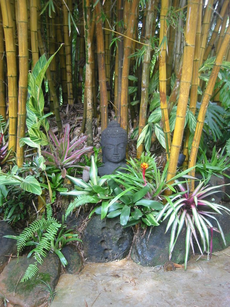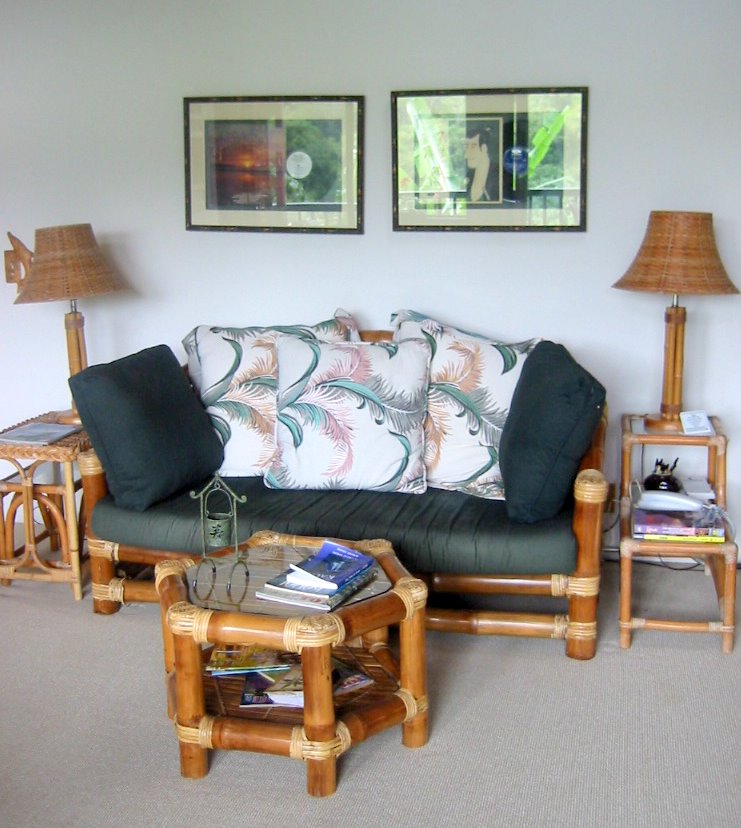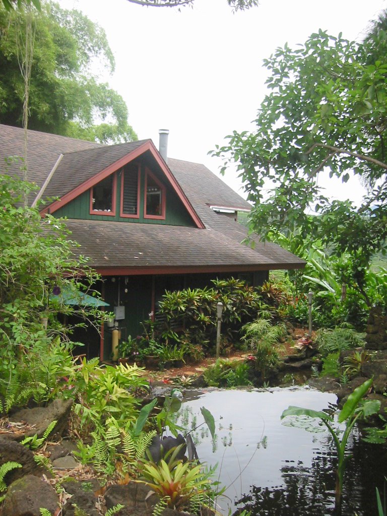 Bamboo, is the upstairs guest house of the owners' home with completely separate and private facilities. It has great river valley views, yet is still only a short walk to two beaches. It has one bedroom with Queen bed, and a walk in closet. The full kitchen has microwave, convection oven, dishwasher, 2 burner range, refrigerator/icemaker, and toaster oven. Living room has fireplace and sliding doors leading out to spacious well-furnished lanai and the gas bar-be-cue. There are 2 TVs with cable/VCR, stereo/CD player, telephone with free island-wide calling, and wireless internet access. A full bathroom has shower and spa tub. Accommodates two guests comfortably