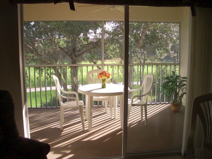 The condo has an eat-in kitchen, dining room, living room, master bedroom with king-size bed, second bedroom with 2 twin beds, 2 baths, vanity/dressing area, walk-in closet and screened-in lanai with a wonderful view over the golf course. There are 2 TVs, a VCR and DVD/CD player, and full size washer and dryer. There's also a queen sleeper sofa in the living room. This professionally furnished unit on the 3rd floor of a modern 3-story building has cathedral ceilings that make it feel even larger.