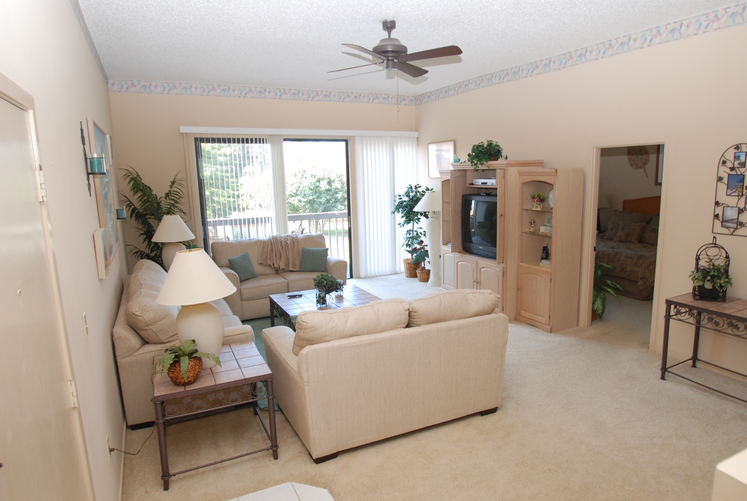 Our favorite room is the large and impressive living room with its 10 foot ceilings. It measures 16 by 24 feet and has an attached large terrace that overlooks a peaceful lake. It has a 32 inch TV, VCR/DVD and a Stereo/CD system for your entertainment enjoyment.