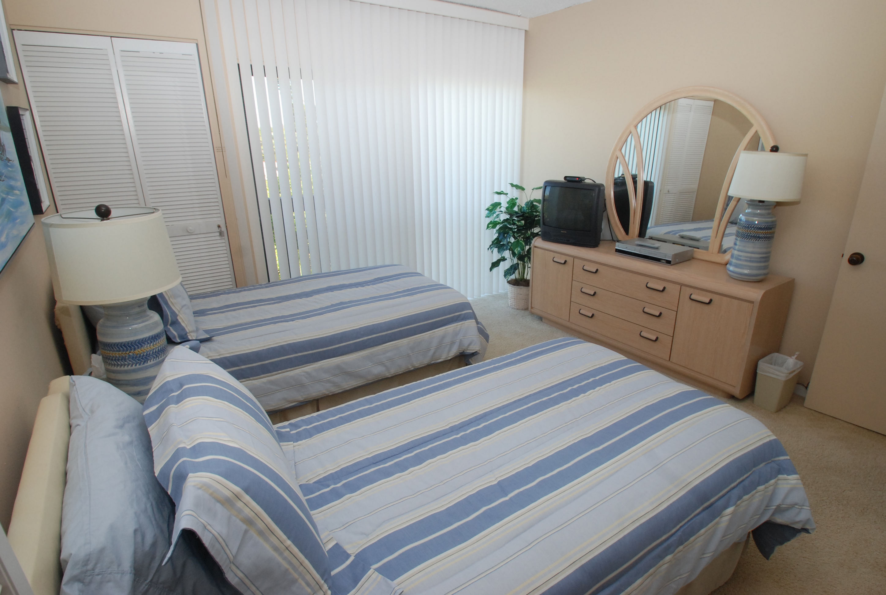 The guest bedroom (12 by 12 feet) with balcony has two twin beds, TV, VCR, a large eight foot closet and its own bathroom.