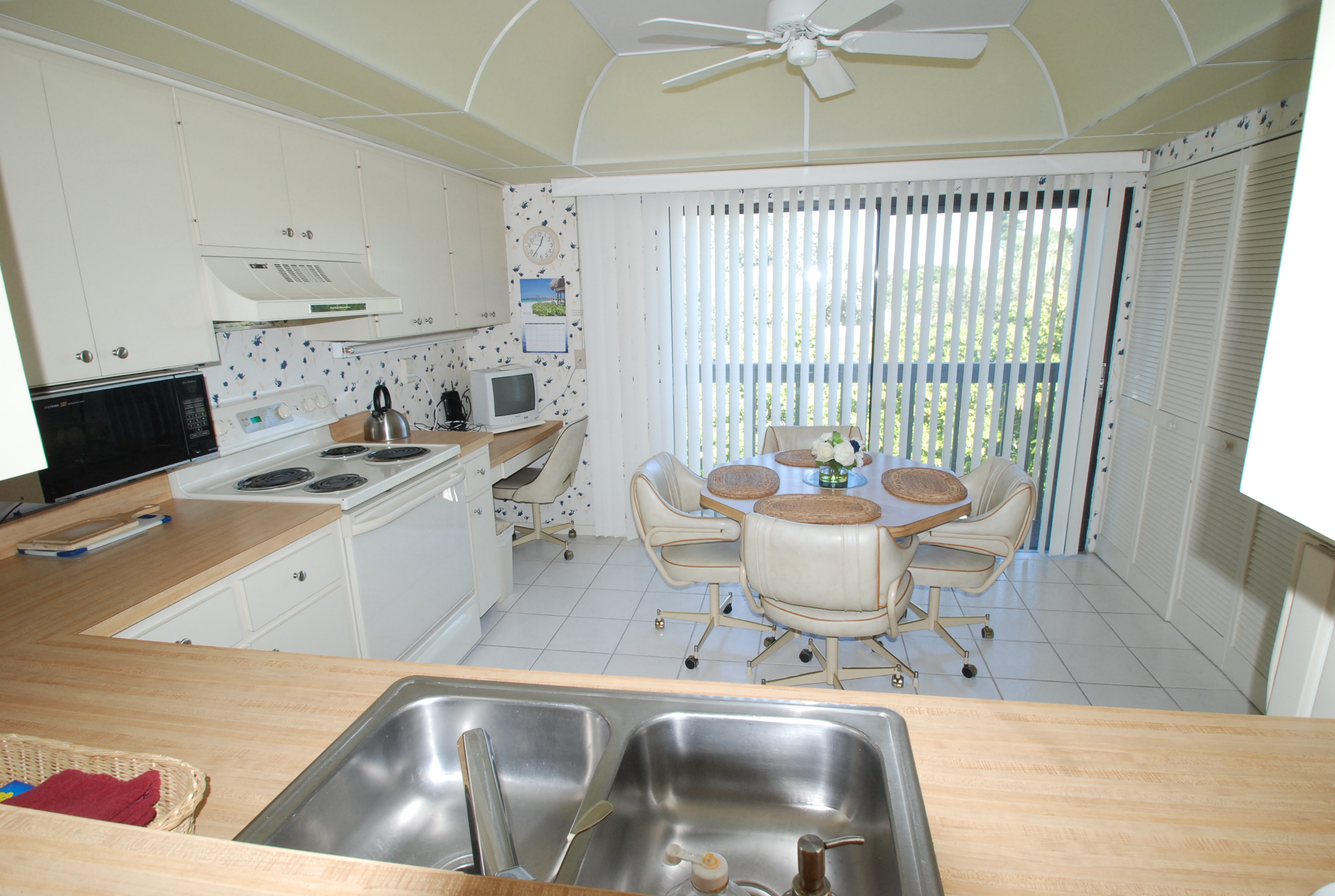 The fully equipped Eat-In Kitchen has a breakfast table for four, all modern appliances, including a dishwasher, microwave, ice maker, coffee maker, toaster and disposal. Additionally it contains the laundry closet with a FULL-SIZE washer and dryer.