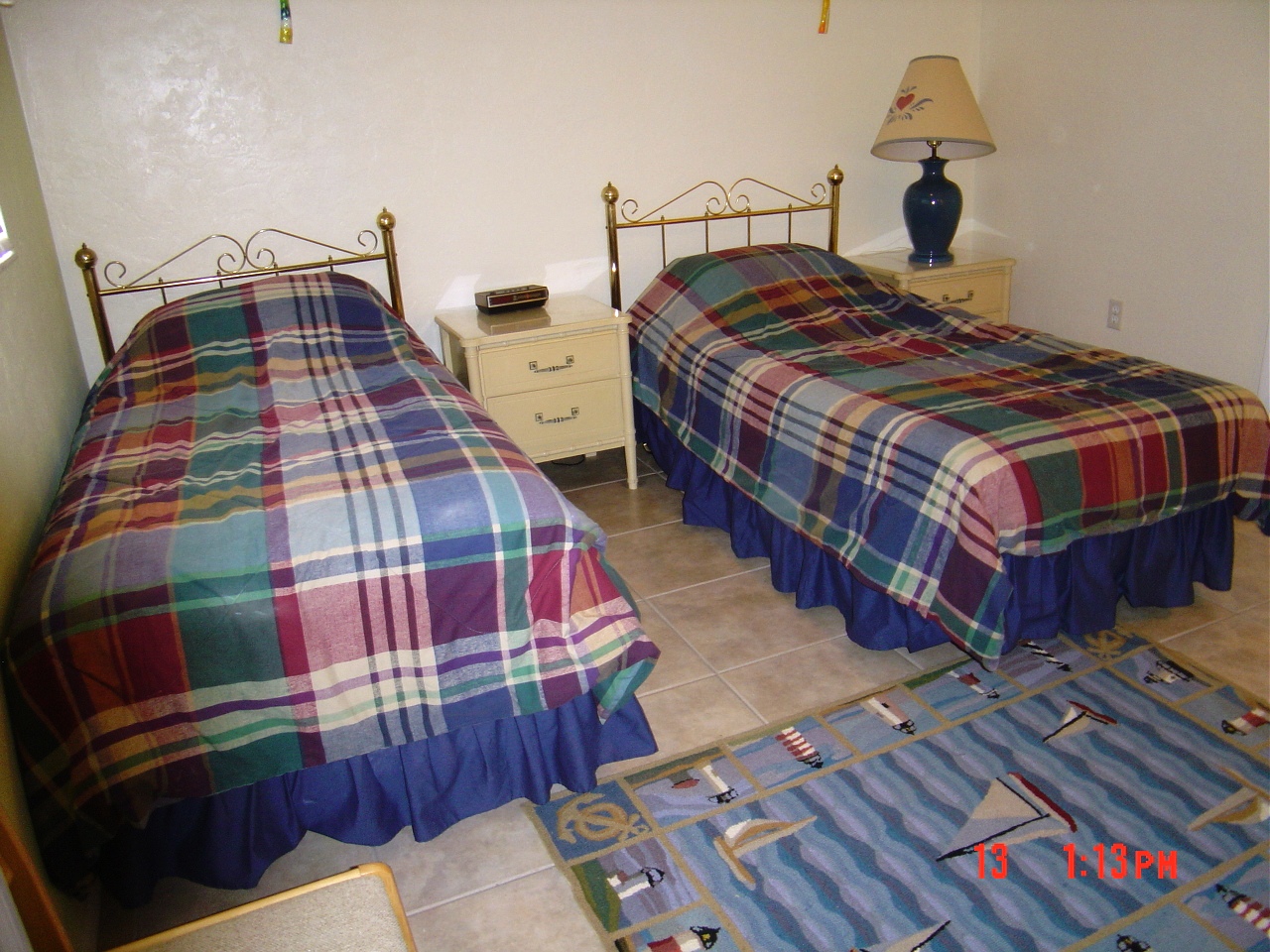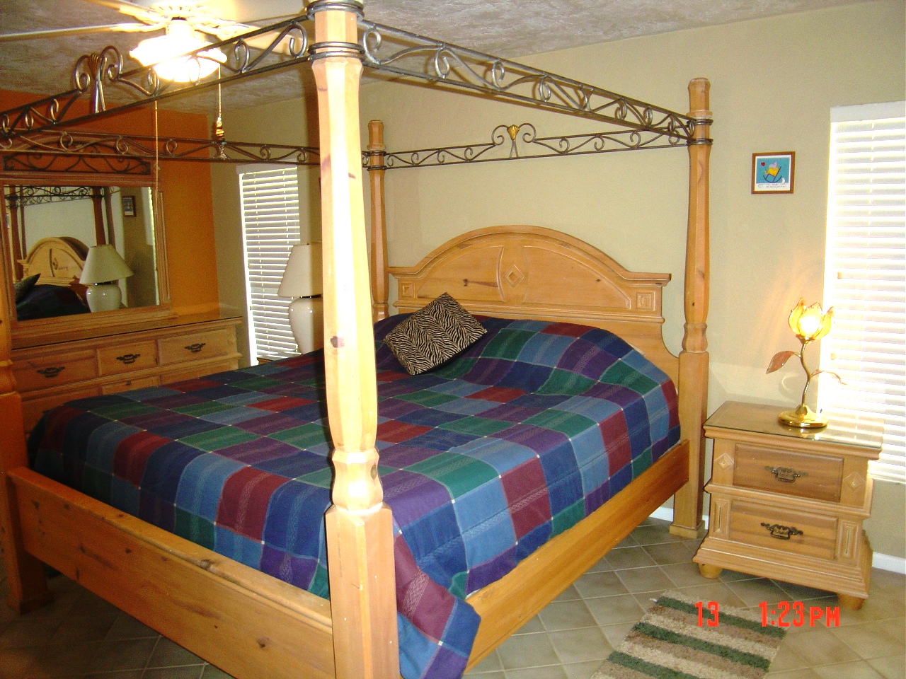 The master bedroom has a king size bed, (6' wide X 6'6''long.) bathroom, TV, clock/radio, walk-in closet.patio doors out onto deck.