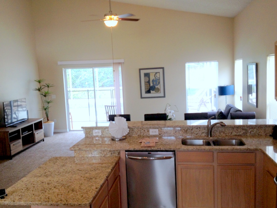 The kitchen is fully equipped with a full size stove / oven, dishwasher, garbage disposal, coffee maker, refrigerator with ice maker. This is perfect for saving money by having your meals at home, or the convienence of having breakfast before you head out to the parks or for a round of golf.