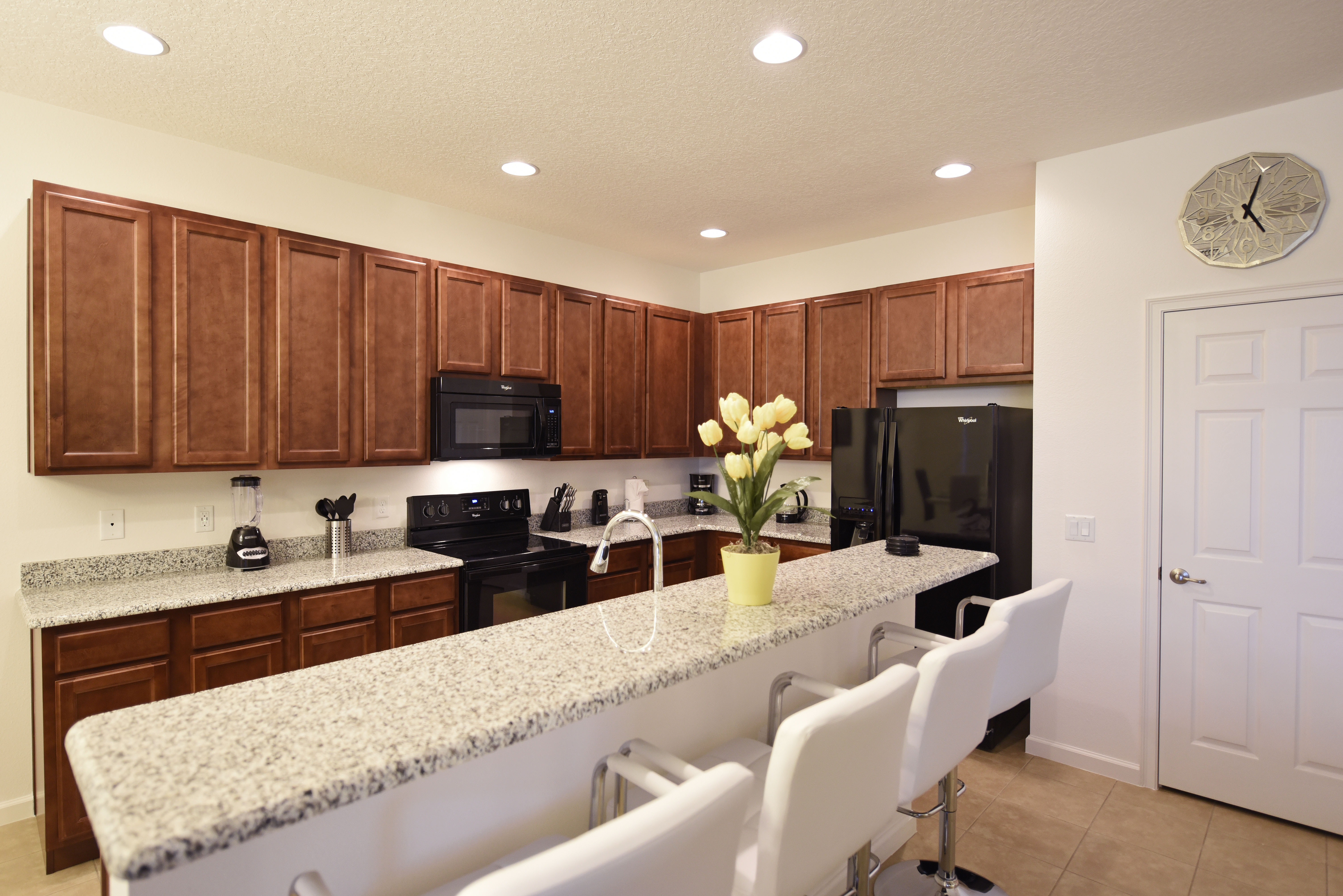 The kitchen is a large full sized kitchen that you'll find fully equipped to make money saving meals at home. The kitchen is just a beautiful place to make your meals with granite countertops. You’ll have easy access to the pool area from the two sliding doors opening to the lanai you'll always feel part of the action even if you are inside preparing a meal or snack.