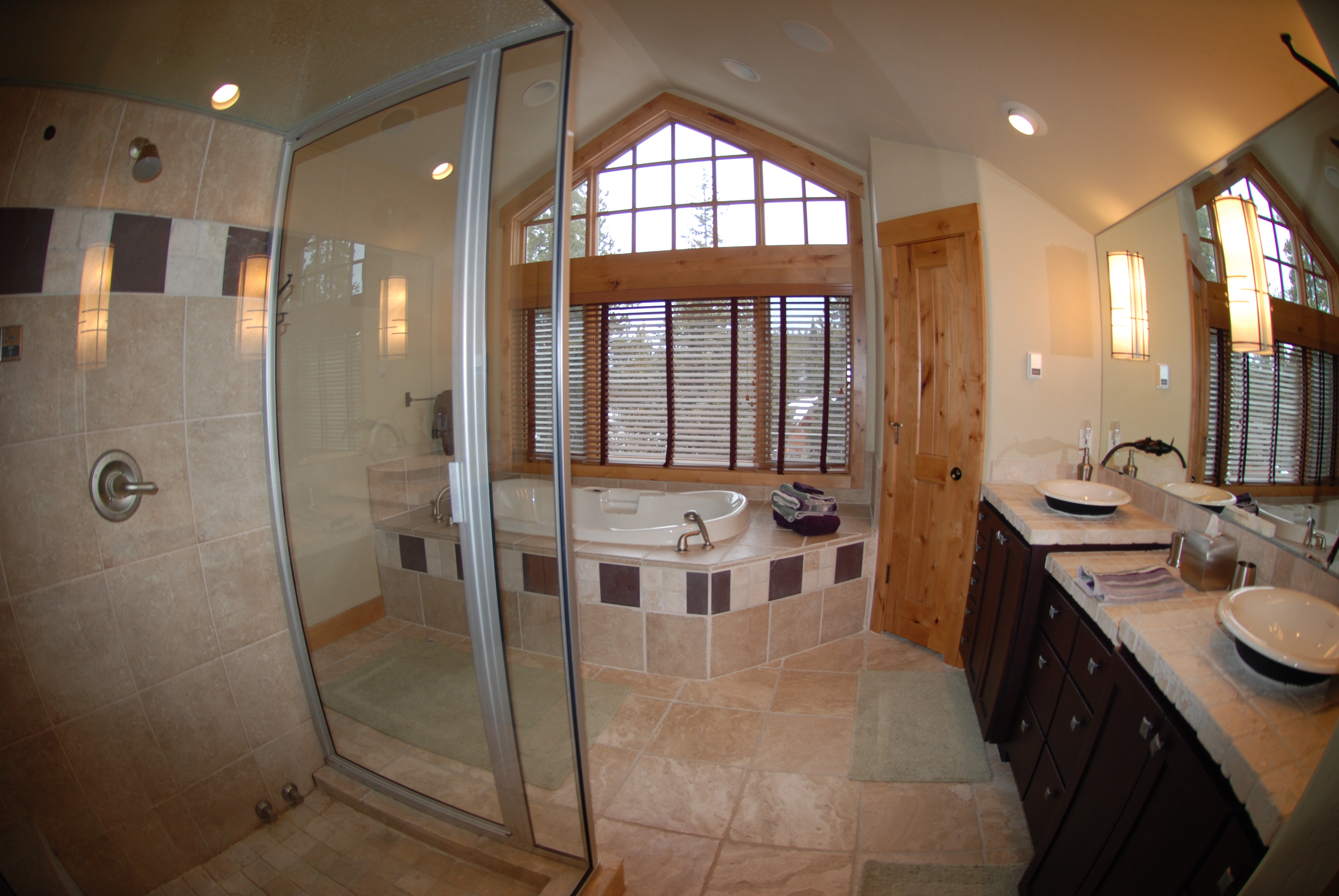 Master: King bed, fireplace, enormous Private Bath with jetted tub, glass steam shower, double sinks, located on the upper level with a TV, DVD, deck
