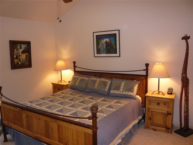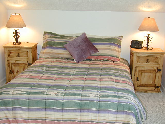 The bedrooms are large and tastefully decorated, with plenty of drawers, shelves and hangers. King bed in Master Bedroom (ground floor). Full/twin bunk with trundle in 2nd bdrm (ground floor). Queen bed in upstairs second Master Bedroom. The large loft has twin trundle beds and a full-sized futon. No problem sleeping 4 kids up there. And there's a TV and VCR in the loft for the kids to enjoy. If you're all adults, the condo very comfortably sleeps 8 or 9.