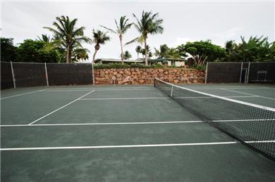 tennis court, lush landscaping with the West Maui Mountains and the ocean in the background. The