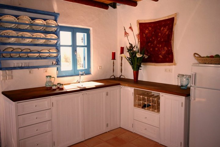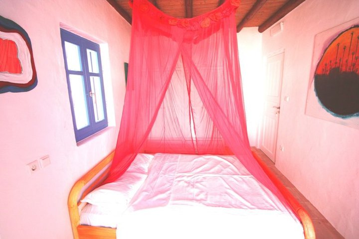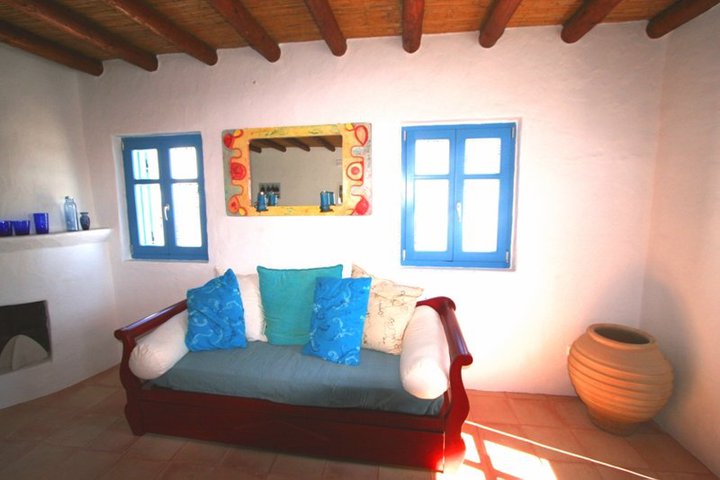 Villa with private pool in the South of Rhodes on the quiet edge of the picturesque traditional farmers village. With fantastic panoramic sea- valley- and mountain views. This property is ideal for couples and smaller parties with the added benefit of the double sofa bed to sleep a maximum of 6. There are some outside seating and dining areas in which to take in the magnificent sunsets. The villa stands in a large 600 sqm plot, surrounded by high walls. There is a covered garage to keep your car cool during the hot days, and that leads directly into the garden. Going into the house one gets into the open plan kitchen/living room. The kitchen is fully equipped and efficient with windows opening onto the outside dining area and with village views. The living area has a fire place and a double sleeping sofa with comfortable mattresses. On the ground floor there is one bedroom with mosquito net, air co and a bathroom with shower, basin and toilet. Going up to the master bedroom, one also finds en suite bathroom next to the bedroom. There is airco and there are doors opening onto a big balcony with comfortable pillows. The view from this balcony is a spectacular one: a sea view as well as a valley view, and at the back of the bedroom there is a window for mountain view. The holiday villa has everything available in the house, as it was your own house. We spared no costs for the looks and all the furniture is made of wood, in traditional Greek design. No foreign or new furniture. There is some art throughout the in- and outside of the house. This villa rent on Rhodes with pool has given all of our guests the most unforgettable holiday in a beautiful surrounding. Outside There are some outside seating and dining areas in which to take in the magnificent sunsets. The villa stands in a large 600 sqm plot, surrounded by high walls. There is a covered garage to keep your car cool during the hot days, and that leads directly into the garden. The whole rental property is walled around, with large wooden doors at the entrance and isolated doors with double glass in the house. Coming into the big wooden doors, one gets onto the property into the covered dining area with extendable teak table and plenty seating. There is a built in BBQ on the side and a washing machine. At the pool area there are sun beds and some chairs and table as well as an outside shower. We have built windows in the outside walls so that one can look at the mountain view at the back of the house. Going to the pool there is a permanent covered area like a summer house. There are sun beds and there is another sitting/dining area where one can sit long evenings. The pool is private. All the furniture is made of wood and has pillows and mattresses. There is a barbecue just outside the kitchen at the dining area. One can go upstairs from the outside to the large balcony with big built couches with mattresses and pillows and one can overlook all the village and sea from there. There is a small herbal garden from where one can take herbs for you tea or cooking: help yourself with sage, thyme, basil, louisa, lavender, oregano, marjoram and so on. The villa stands on large premises with a group of 3 villas with pool. The last villa in the private dead end street is villa Meltemi