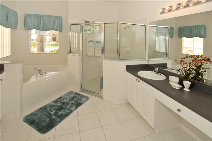 Enjoy Your Stay: First Floor: The first floor of this luxorious villa is tiled including a formal living and dining area. The living area has a leather sofa bed, a custom designed chair and a 42' flat screen TV for guests to enjoy. The formal dining area seats 8 people with unique art works surounded. Beautiful window treatments, artwork ,accent painted walls and an upgraded furniture package makes this villa very homely and welcoming. The master bedroom is on the first floor with a king sized bed, LCD TV and an ensuite. There is a second bedroom on the first floor with a queen bed and LCD TV. The open concept design of the great room includes a kitchen, breakfast nook and family room, with brand new high end modern furniture and stainless steel appliances. This huge welcoming area is the perfect place for family/friends to gather. The family room has a comfortable leather sectional sofa, two lovely swivel chairs and 47' flat screen TV with WIFI enabled.