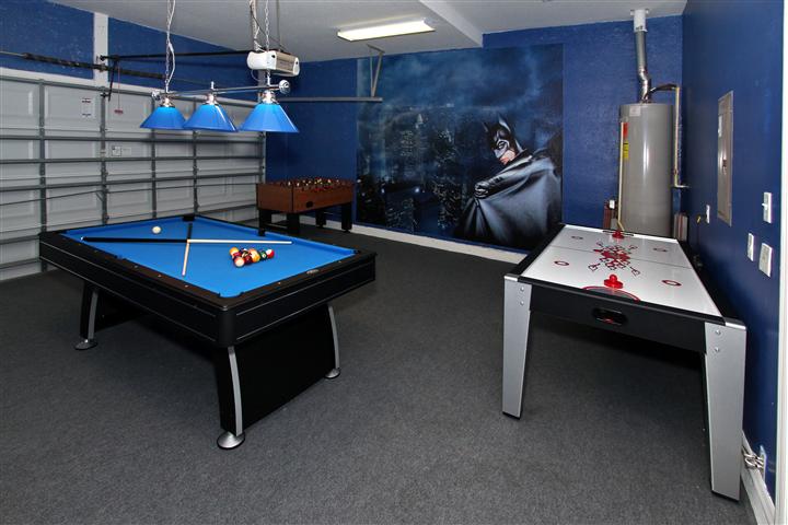 The game room is in Batman dark night theme and is well equipped with multiple game tables, including pool, foosball and air hockey.