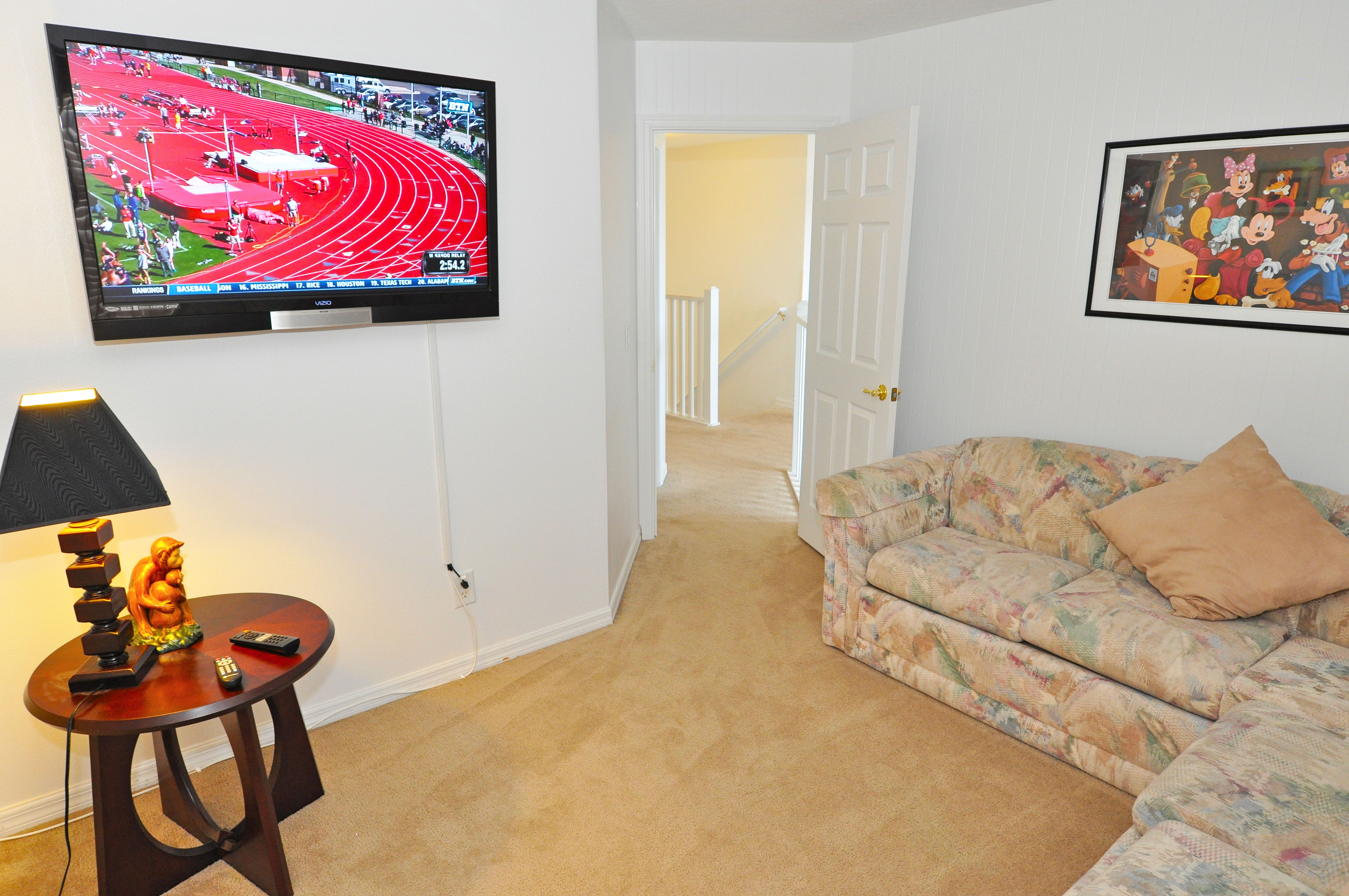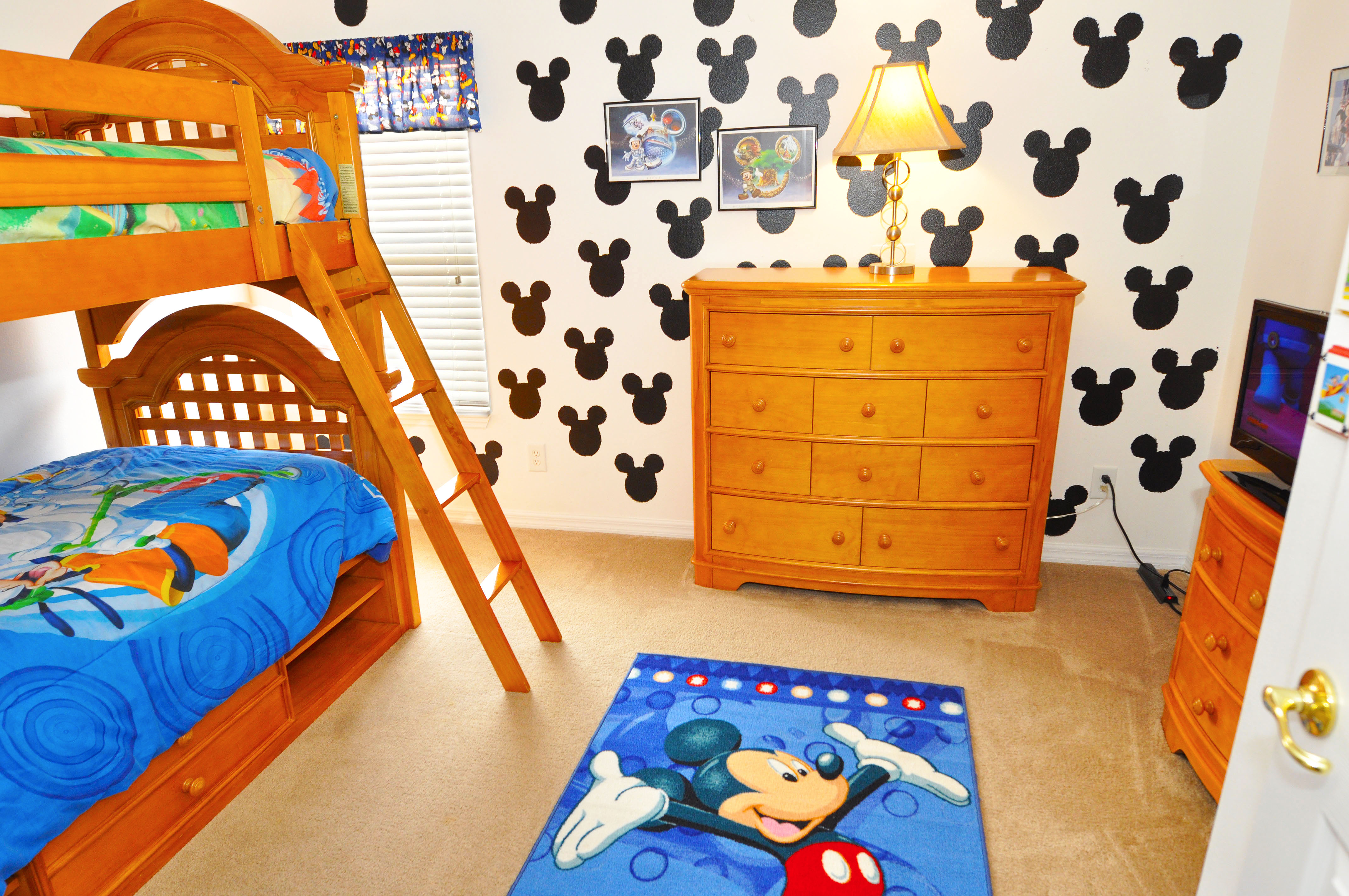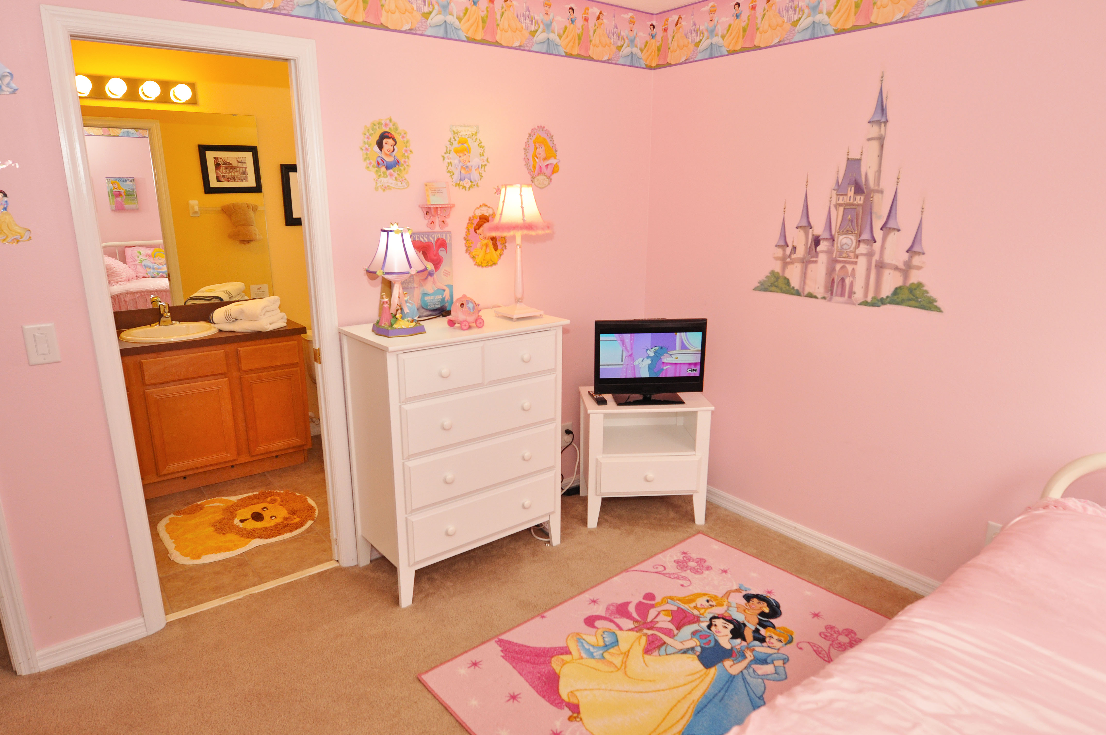 One of the spacious Master suites is on the ground floor, with walk-in closet, and the other 5 bedrooms are upstairs. These include another spacious Master suite, a Queen Guest Room with en suite bathroom, both with walk-in closets and cable TV’s, Mickey’s Room with bunk beds, flat screen cable HDTV, etc. and The Princess Room, which will capture the dreams of every young lady – or ladies – who are lucky enough to stay in it.