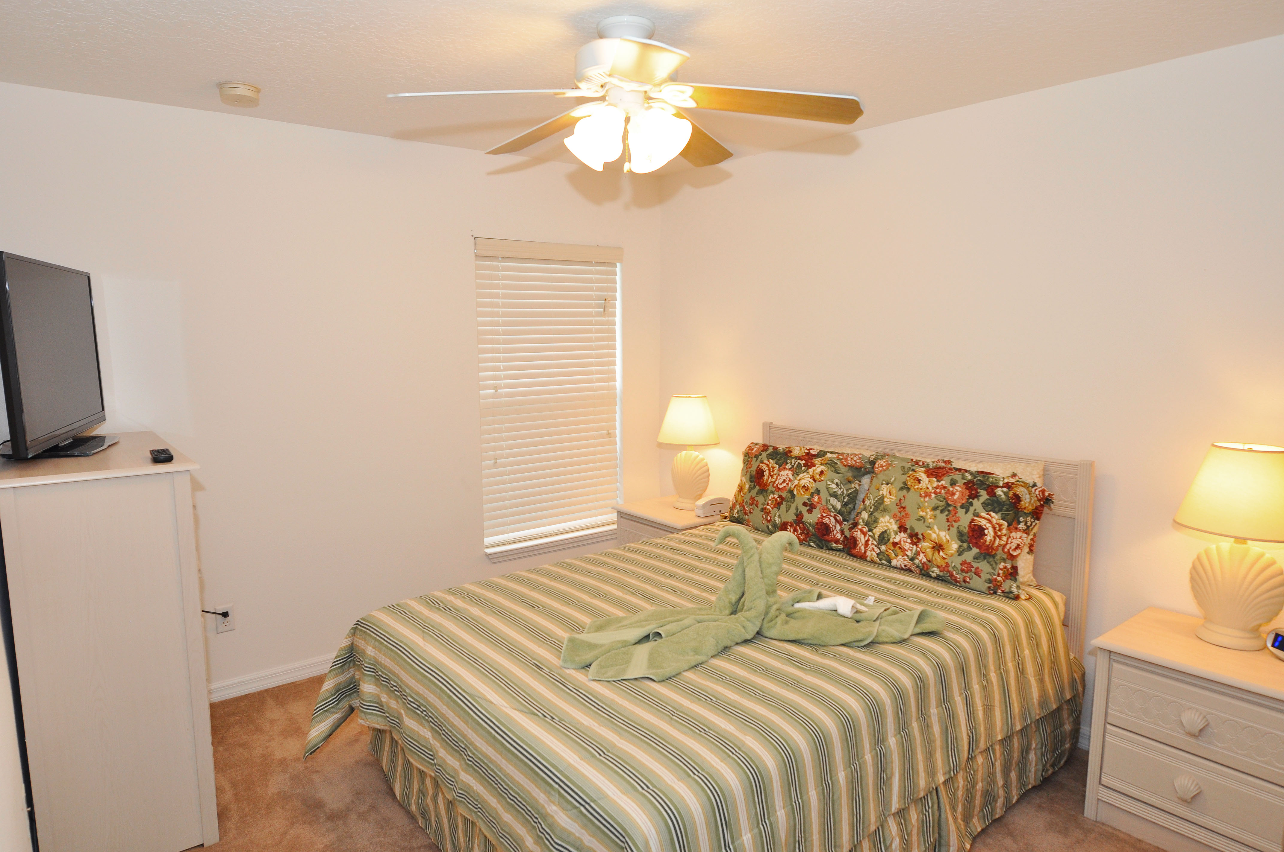 The second master suite has a Queen size bed, built in closet, TV,chest of drawers, table, lamp and alarm clock. The adjoining private bathroom is equipped with bath, sink, shower and toilet.