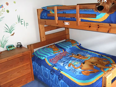 Bedroom 3 is a child’s dream room decorated with a Scooby Doo theme. It has a double bed with a single bunk above, Television with Cable Channels, DVD player, VCR, PS2 Games Console, games, 2 chairs a tower fan and drawer unit. A single fold away bed with bedding is also provided.