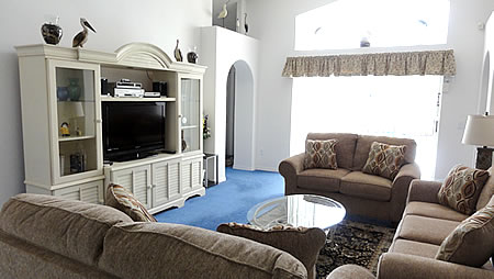 The Lounge - This light bright and airy room with high ceilings is fully carpeted and lavishly furnished with a Floridian feel. The room with three comfortable settees, occasional tables, table lamps and ceiling fan has a Large LCD HD Television connected to HD and Digital Cable Channels which include the Disney Channel, Fox Sports for UK premiership football games and Speed for the F1. Within the elegant entertainment unit you will also find a Hi-Fi system with IPod docking, VCR and DVD player, a selection of videos & DVD’s, books and games for all the family to enjoy.