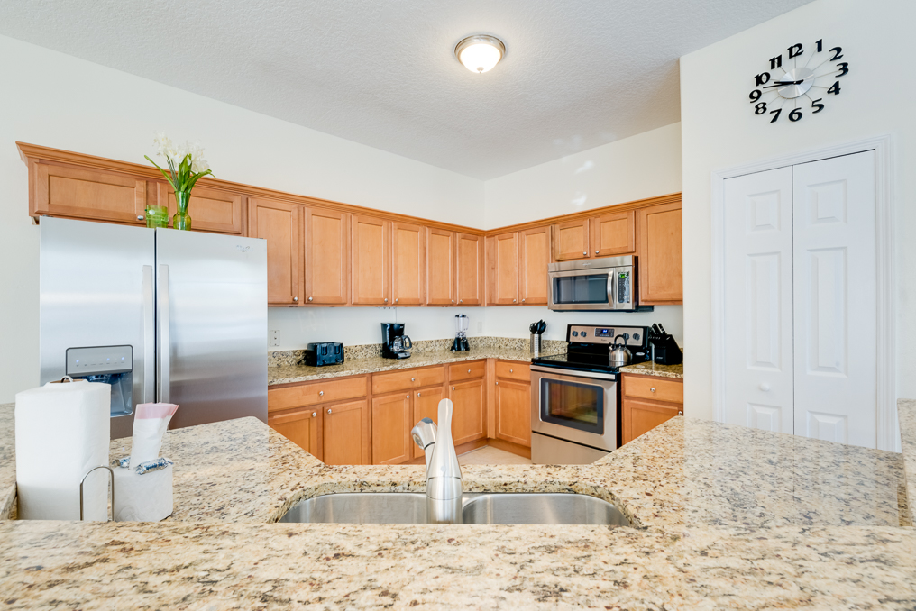 Fully equipped kitchen is so nice to come to home to after a long exhausting day in the parks. A place to make a relaxing meal, a cold drink and access to the cool pool to rest your exhausted, park weary body! The beautiful granite counters and stainless steel appliances are a dream for the cook in your family
