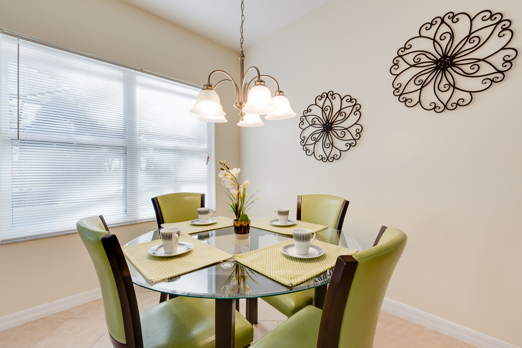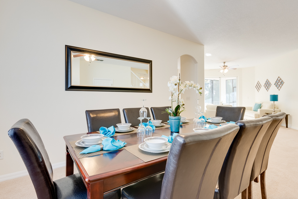 The large open planned family room has a 40′ flat screen cable TV, DVD, and Wi-Fi. Patio doors lead out to the lovely pool area. The open floor plan allows your family to relax and enjoy each other’s company during meals, playing a game or watching a movie together