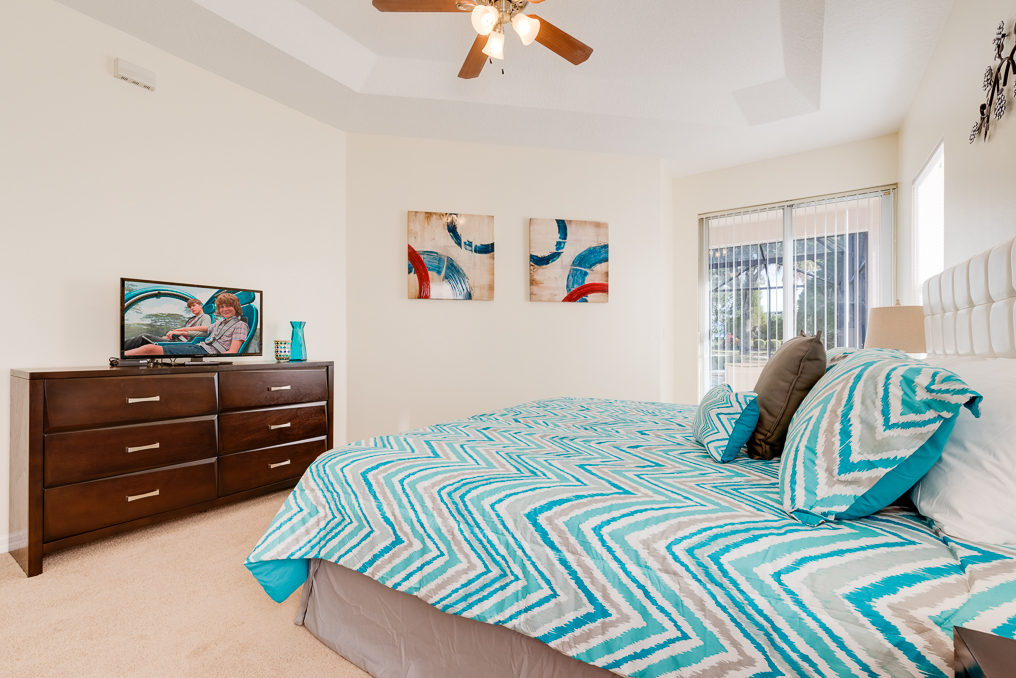 There is a second master bedroom, one with a kng bed and an en-suite bathroom. Enjoy direct access to the pool area through private doors from your bedroom. There is also a flat screen television.