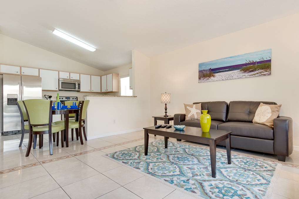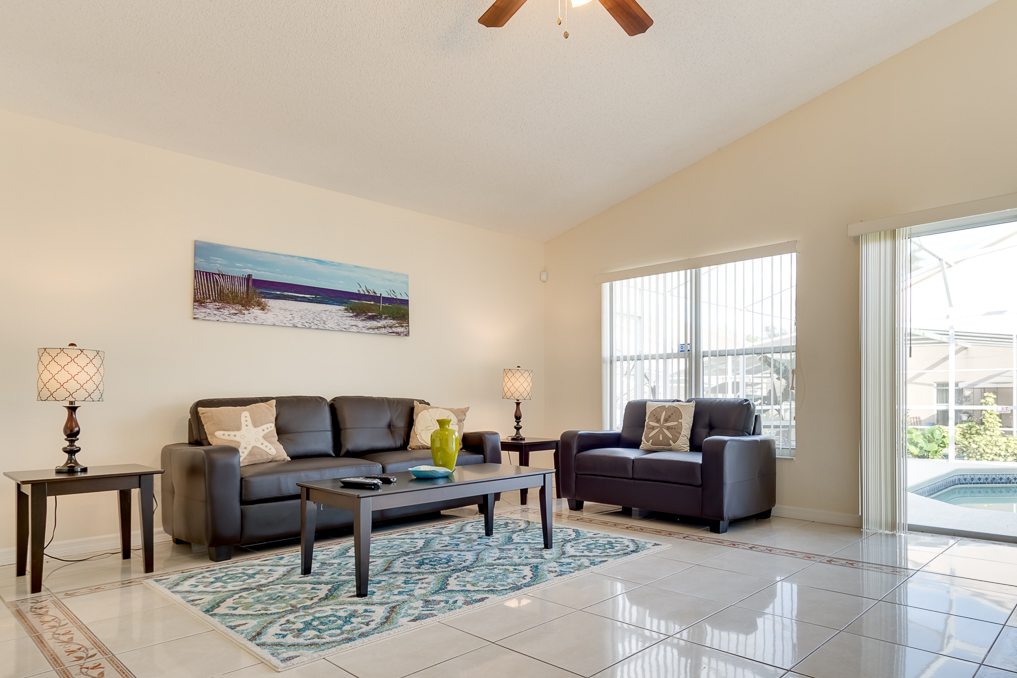 This spacious open floor plan for this 4-bedroom vacation home with 3 bathrooms has a fantastic, large private pool right outside your living room doors.