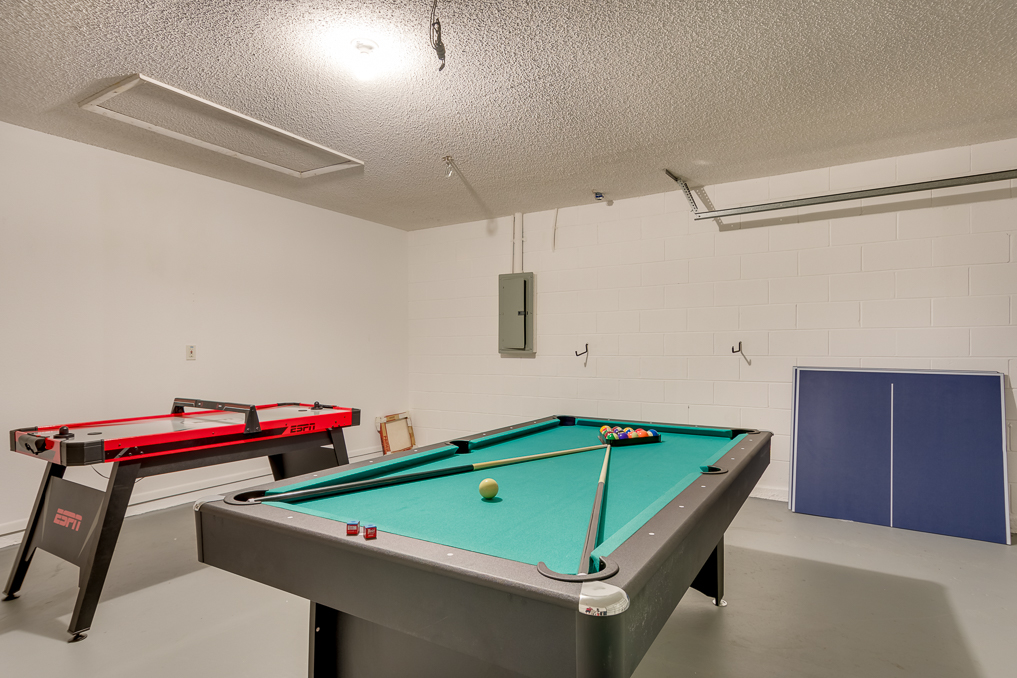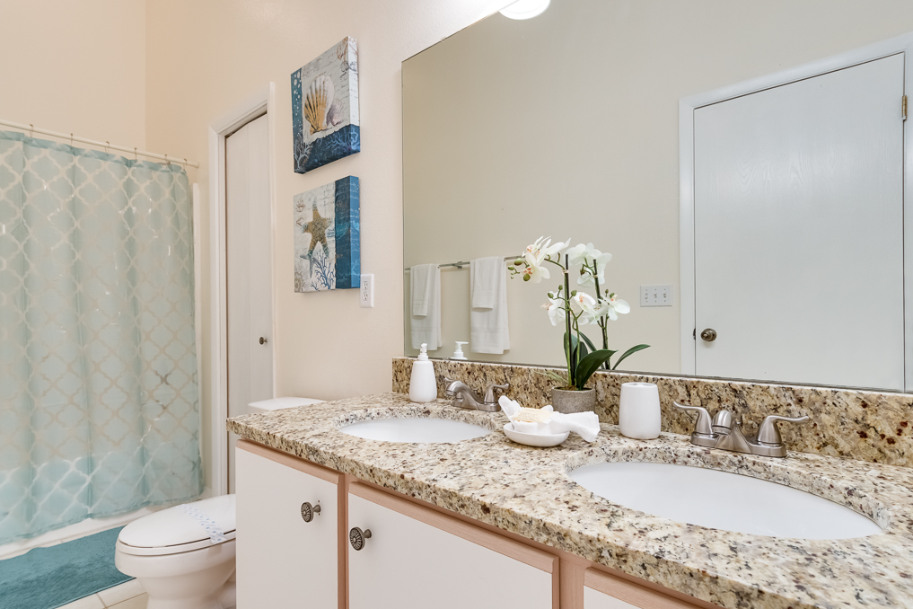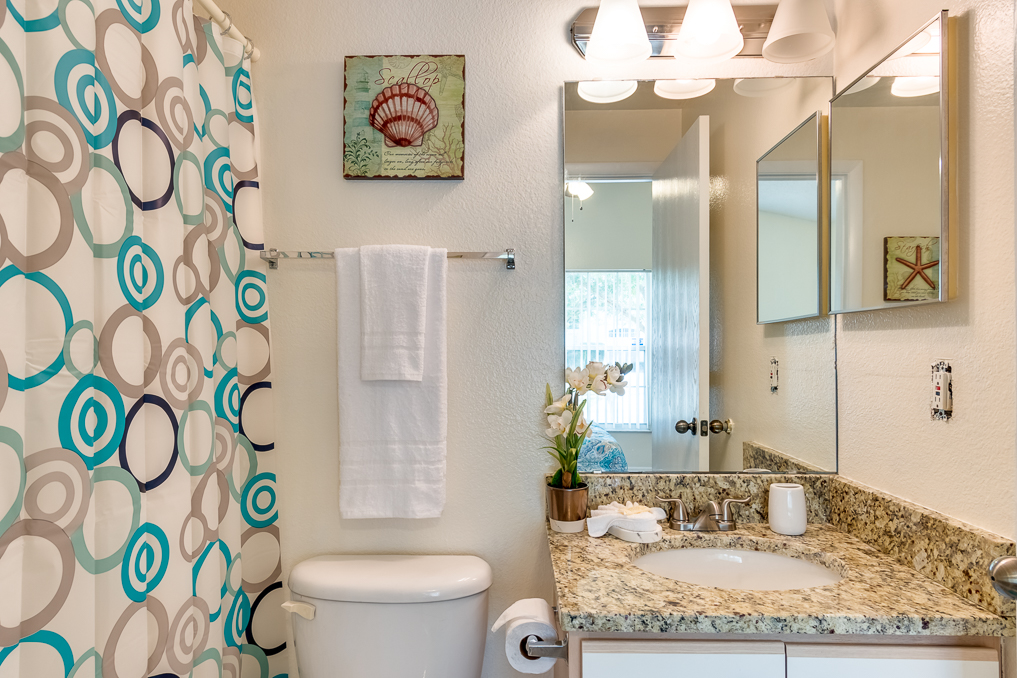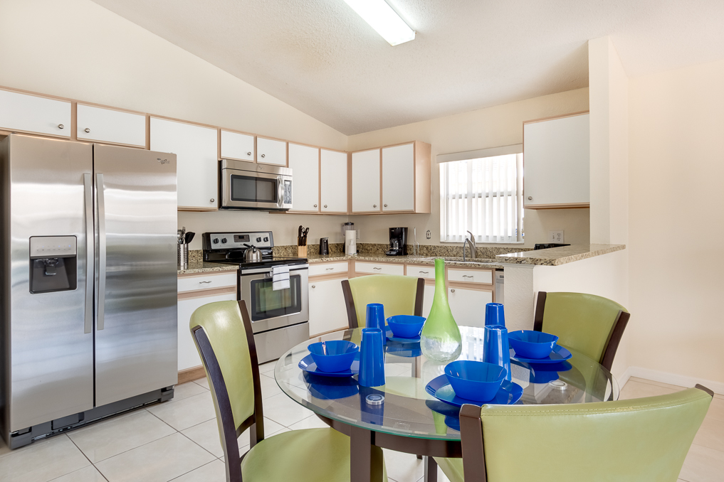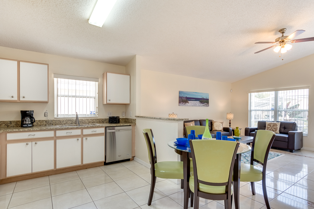 The kitchen is fully equipped with a full size stove / oven, dishwasher, garbage disposal, coffee maker, refrigerator with ice maker, stainless steel appliances and granite countertops. This is perfect for saving money by having your meals at home, or the convenience of having breakfast before you head out to the parks or for a round of golf.