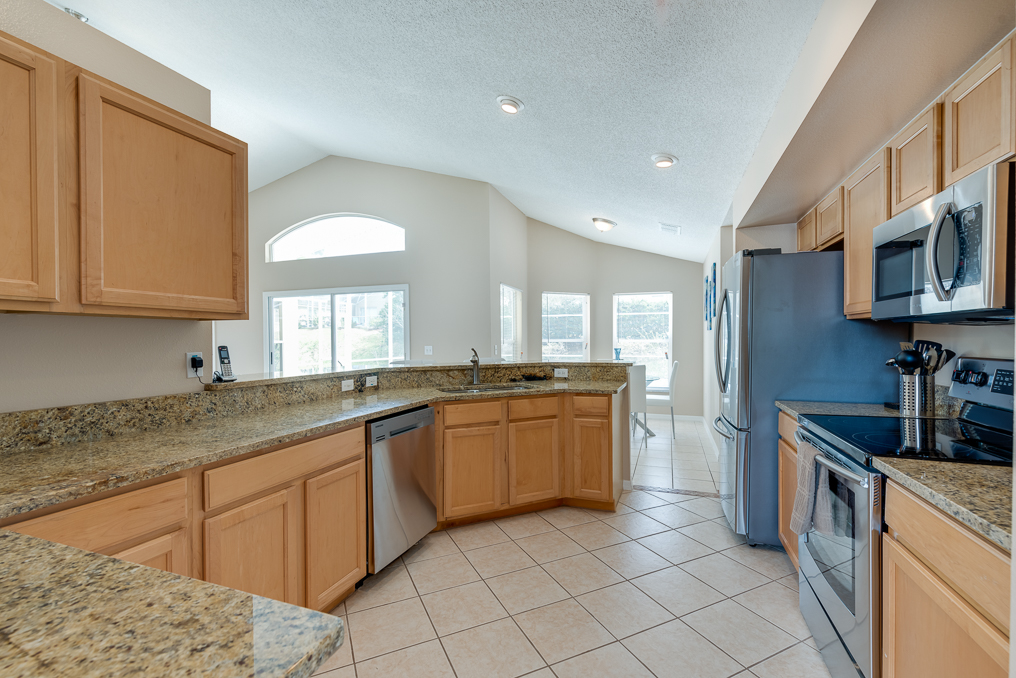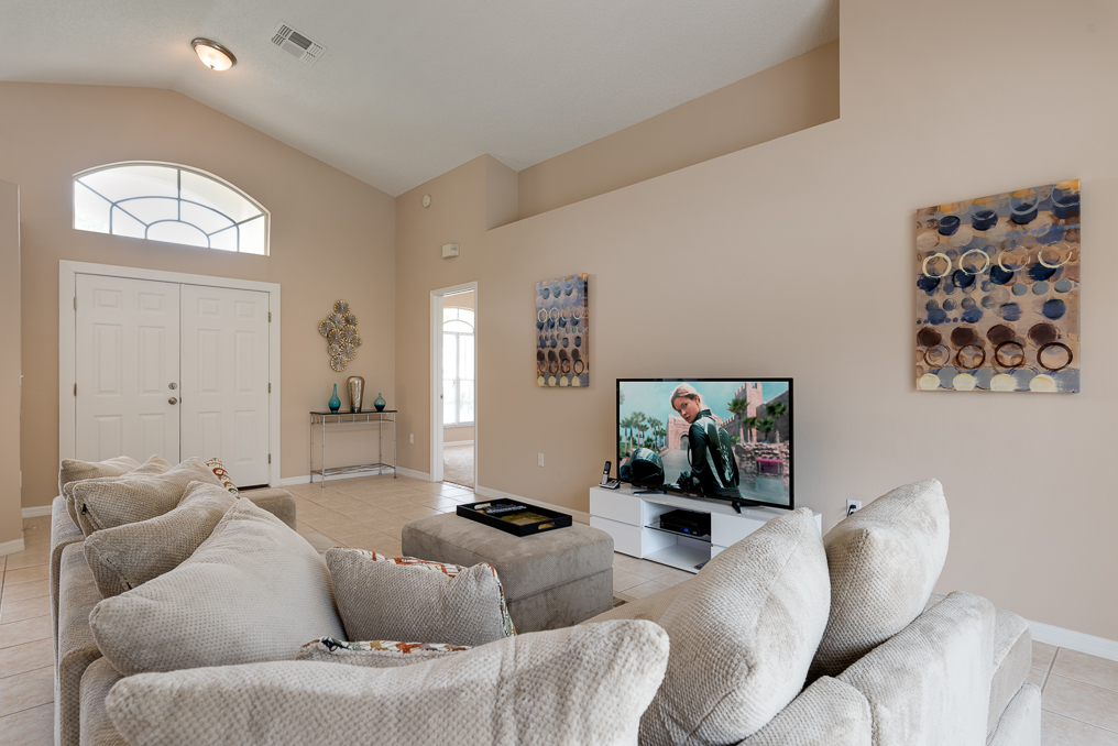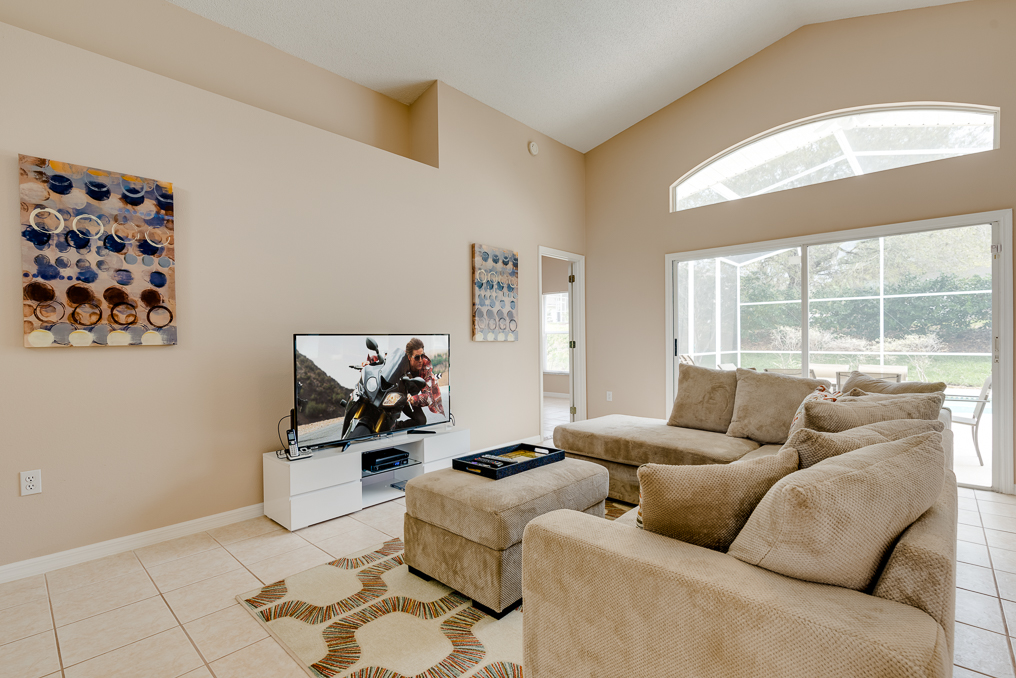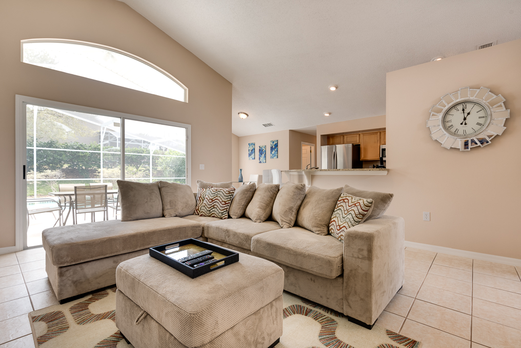 The living area in this home has cool calming colors, soft couches and a 50" flat screen television for pure relaxation. The oversized sliding glass door gives you immediate access to the pool area from the kitchen or living room so that you and your family will always feel part of the action no matter where they choose to relax.