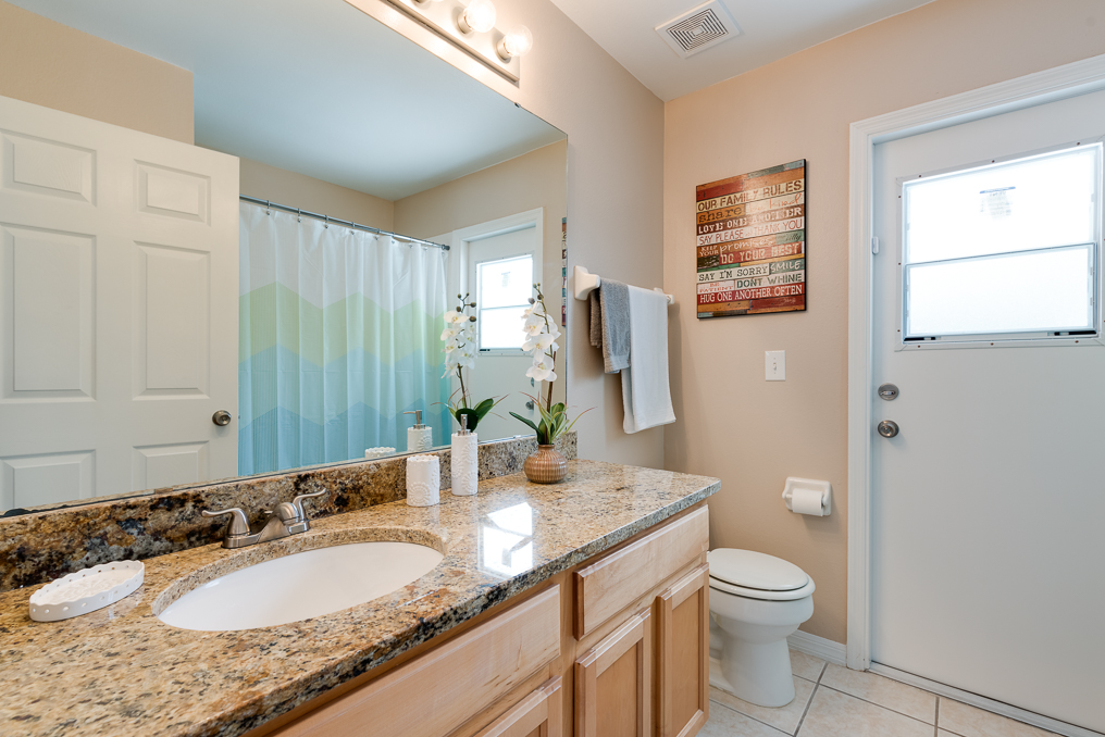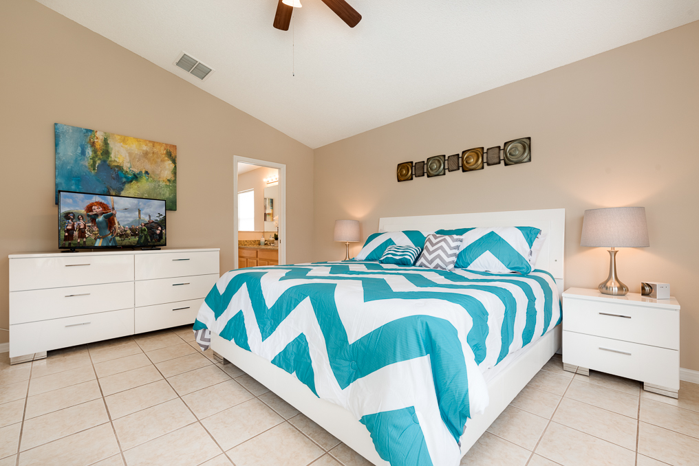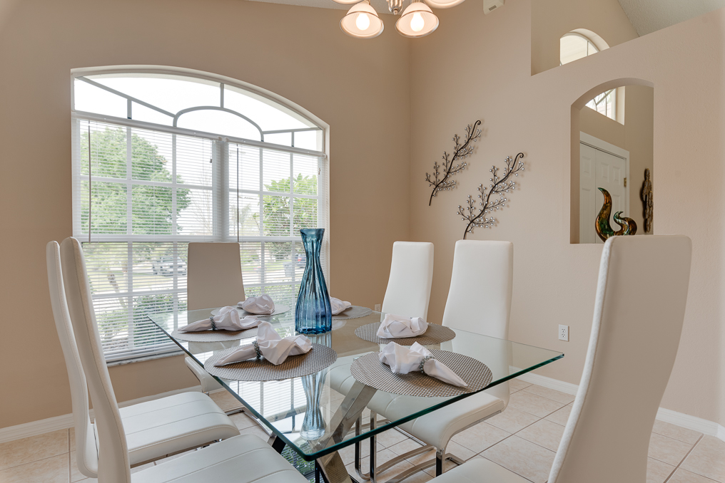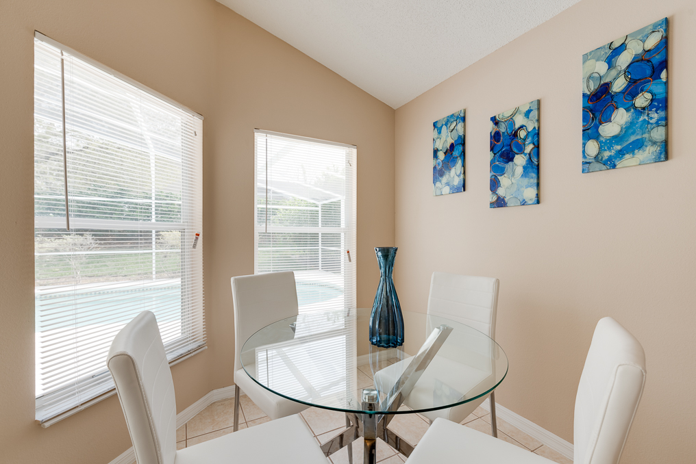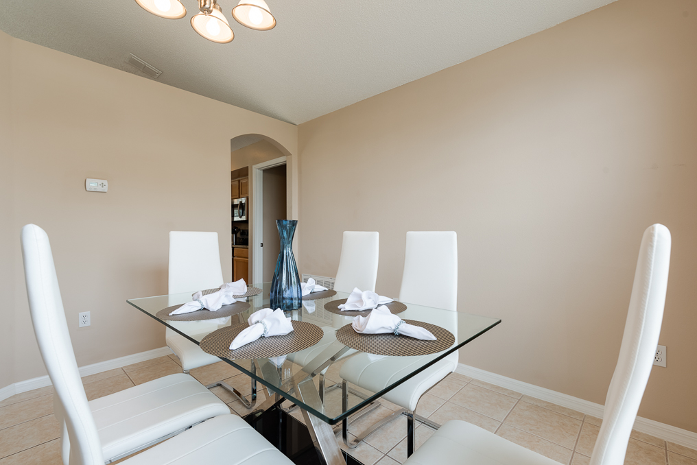 The living area in this home has cool calming colors, soft couches and a 50" flat screen television for pure relaxation. The oversized sliding glass door gives you immediate access to the pool area from the kitchen or living room so that you and your family will always feel part of the action no matter where they choose to relax.