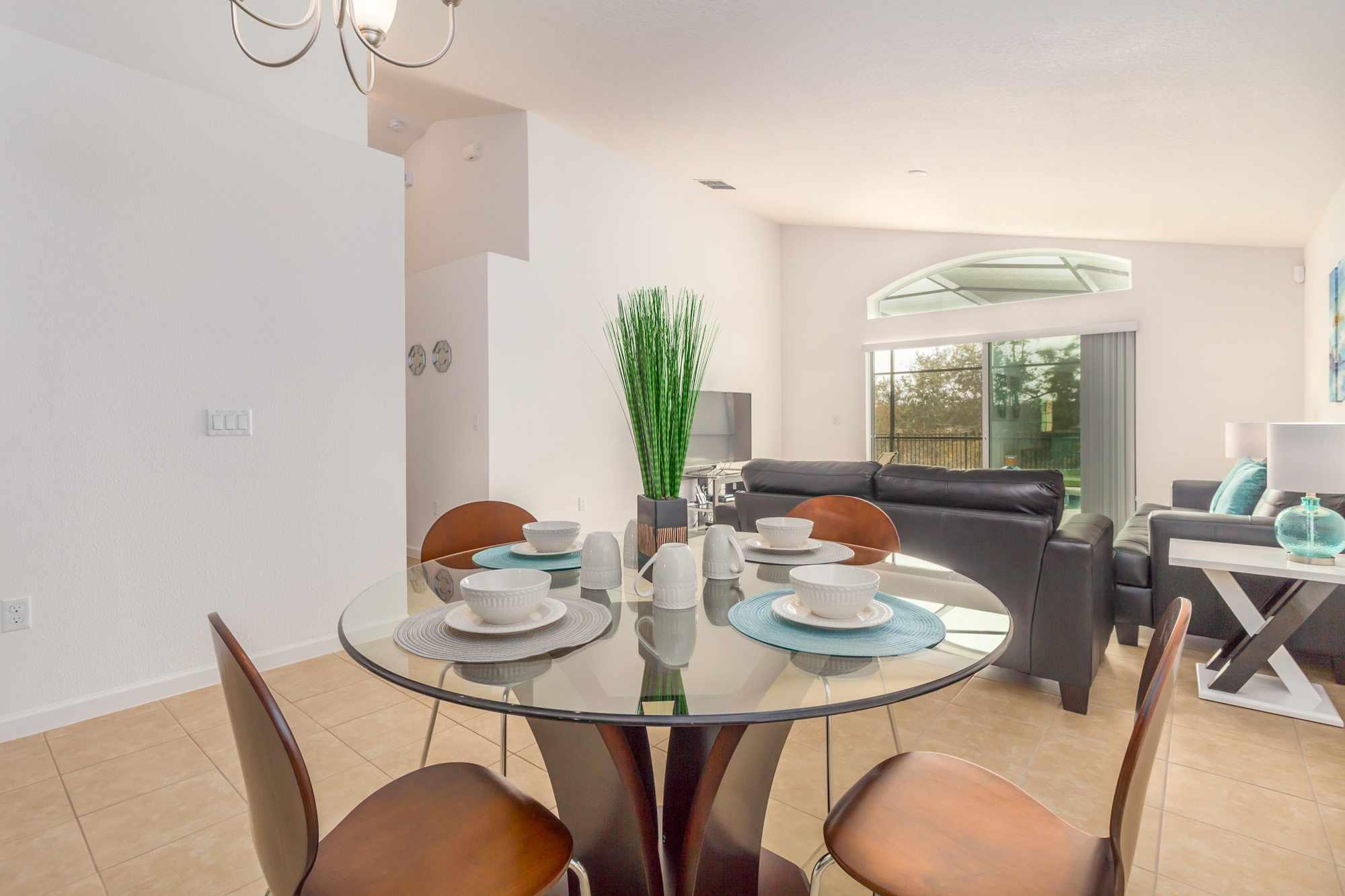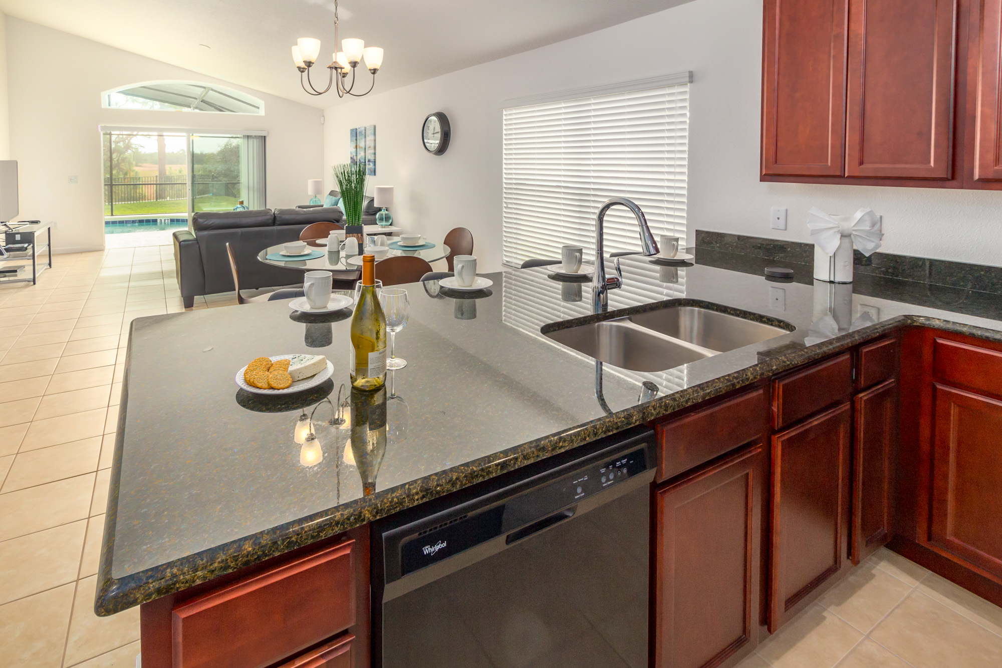 The bright and airy kitchen offers plenty of room for the large family. Our appliances in the kitchen include refrigerator, range, microwave, dishwasher, blender, coffee maker, 4 slice toaster, cookware and glasses. It is equipped with everything to prepare a family feast for any occasion. You have a choice of eating in the kitchen area or out on the patio by the pool.