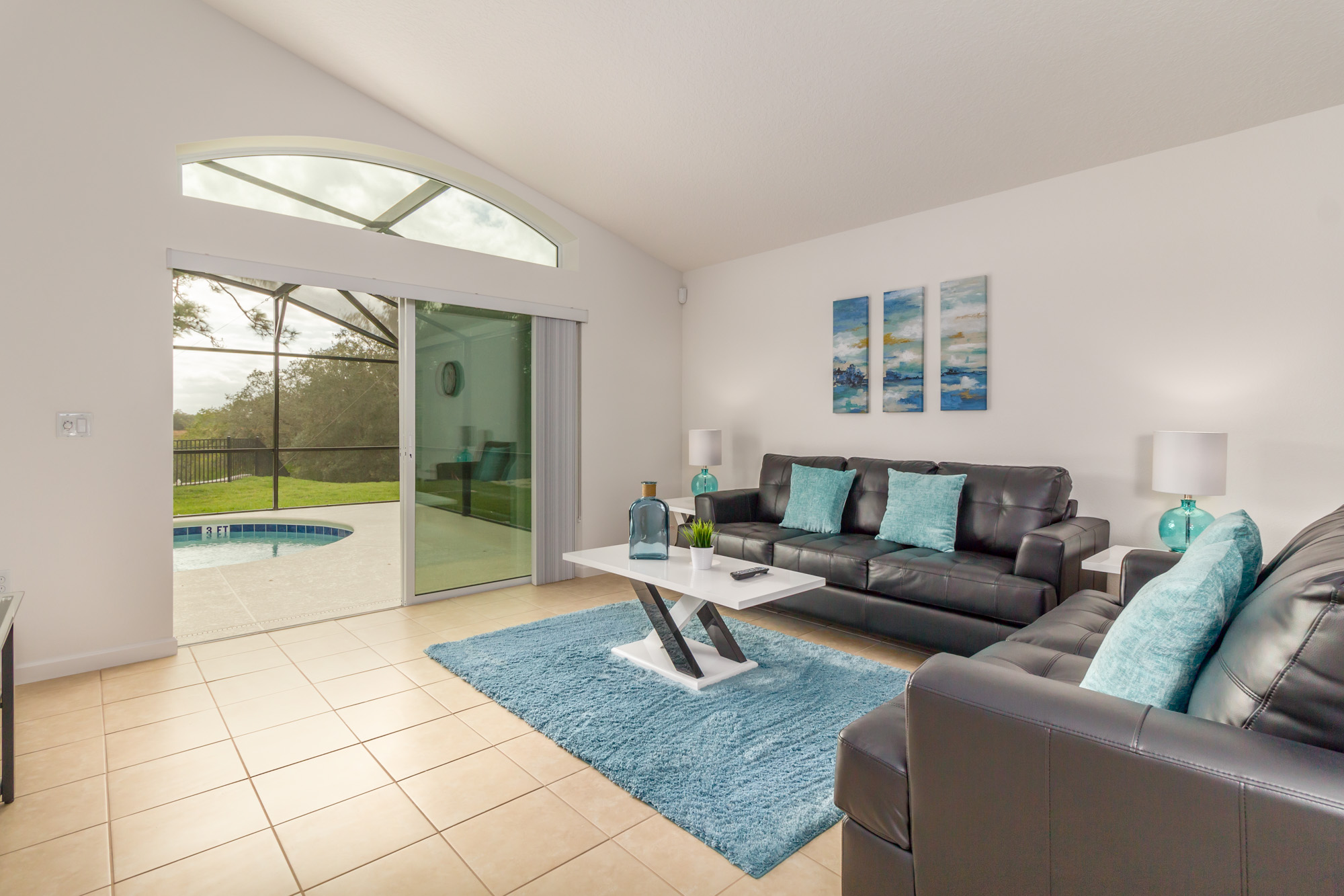 You'll love the spacious family room with comfortable leather sofas and a large flat screen television. This lovely area has sliding patio doors that open onto the pool deck. You have a second living room as you enter the house perfect for quiet conversation or as a wonderful place to read a good book comfortably seated on a lovely soft sofa or loveseat.